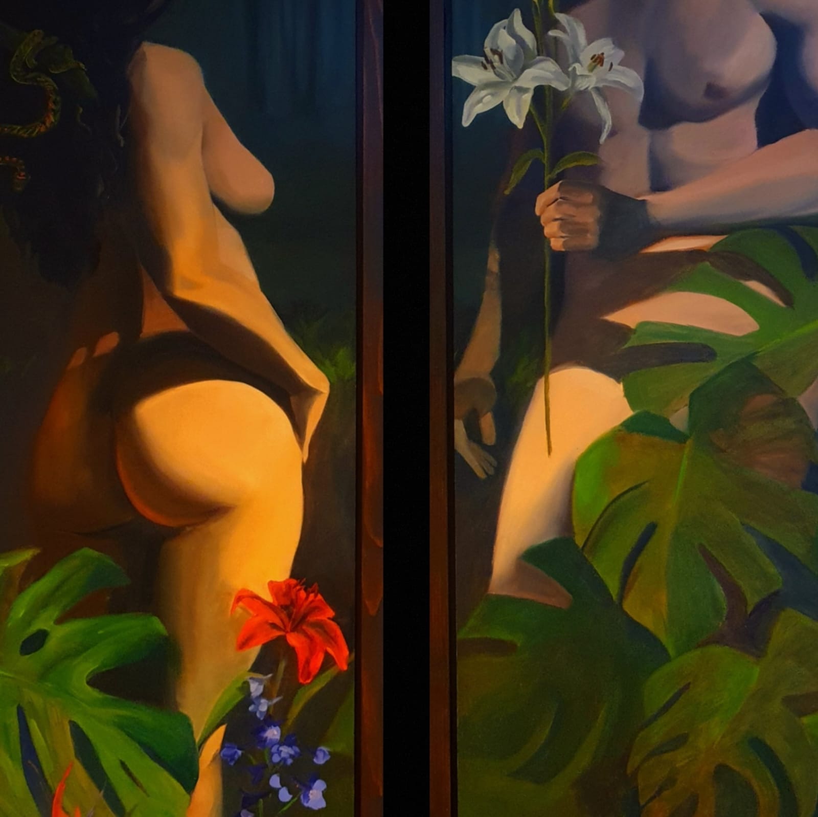 Adam and Eve, Rachel Climo, oil on panel 45x170cm x2